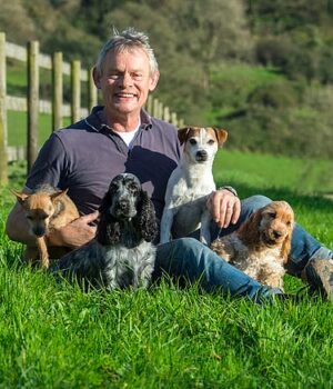 O ator Martin Clunes com seus quatro cães em sua fazenda perto de Beaminster, Dorset