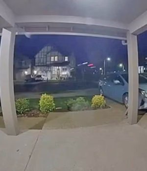 Imagens chocantes capturaram o momento em que uma caminhonete voou 30 metros no ar e bateu em uma casa em Tigard, Oregon. Uma imagem do vídeo da câmera da campainha é mostrada acima