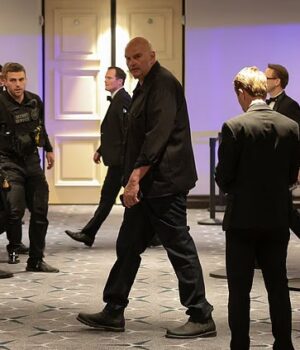 O senador norte-americano John Fetterman, um democrata da Pensilvânia, caminha após um tiroteio durante o jantar anual da Associação de Correspondentes da Casa Branca em Washington, DC, EUA, em 25 de abril de 2026.