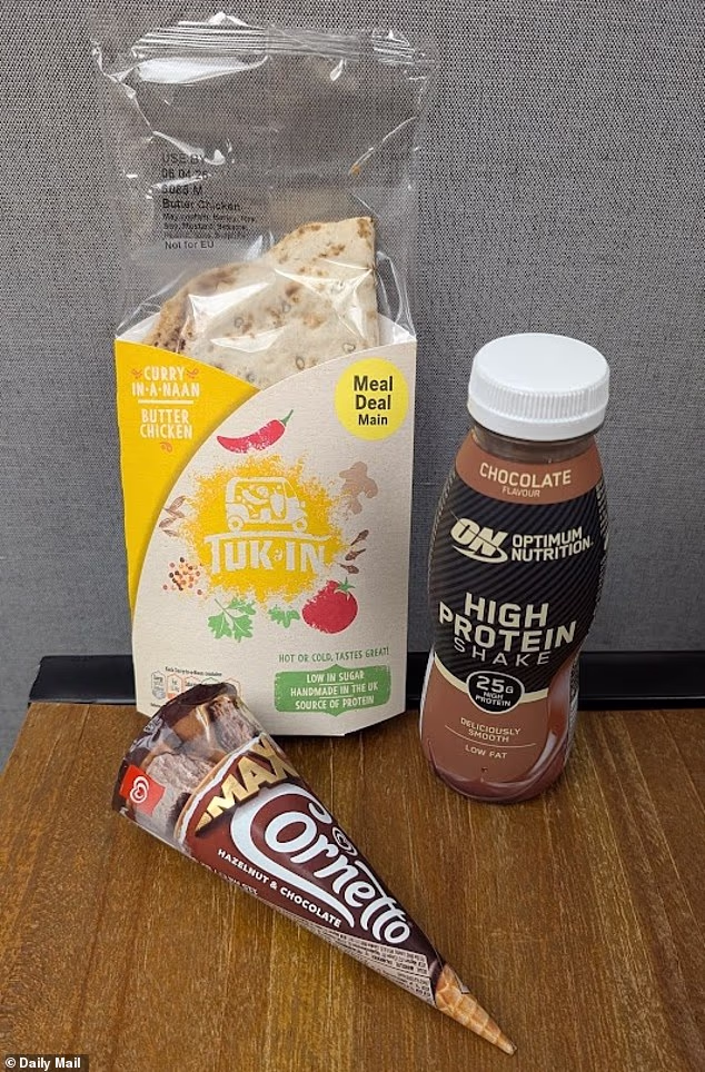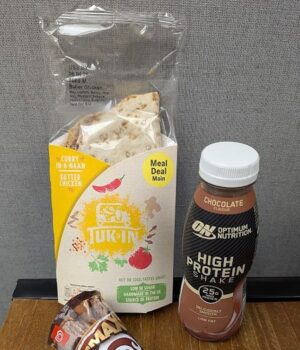 O maior desconto possível em uma refeição Tesco de £ 3,85 é de £ 5,45, de um total de £ 9,30. Este é composto por Tuk in Curry em frango sem manteiga por £ 3,45, Cornetto Max Hazelnut e Chocolate por £ 2,50 e Batido de Chocolate Optimum Nutrition High Protein 330ml por £ 3,35.