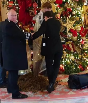 Os trabalhadores esvaziaram sacos de esterco debaixo da árvore de Natal no saguão, deixando um monte da substância marrom fedorenta no tapete macio enquanto os seguranças corriam para intervir.