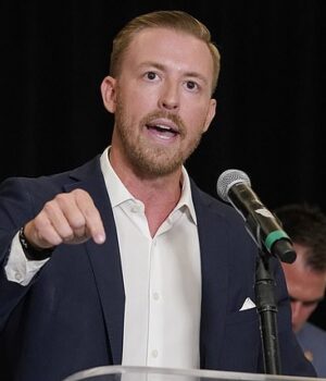 O superintendente de Oklahoma, Ryan Walters (ilustrado), tornou-se uma visão de humilhação e indignação em uma entrevista coletiva na quinta