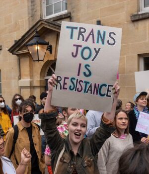 Há um ano, o Gabinete para Estudantes (OFS) multou a Universidade de Sussex em £585.000 pelo tratamento dado à académica Kathleen Stock, crítica de género. Foto: Estudantes protestando na Oxford Union