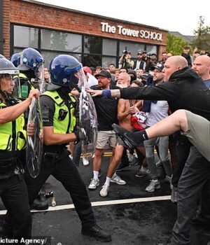 Cerca de cinco manifestantes vieram e a polícia ‘trabalhou para manter a disciplina pública e separar os dois grupos’, mas ‘policiais foram submetidos a ataques sustentáveis por mais de quatro horas’.