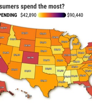 A despesa geral do consumidor na Califórnia é igual a US$ 65.340 por residente em 2024, que é a quarta maior do estado. Foram mais de US$ 56.700 gastos em US$ 8.640 nacionalmente.