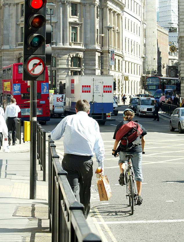 Os motoristas de ciclo foram vistos passando pela sede do Banco da Inglaterra na cidade de Londres, onde as autoridades locais estão lançando uma nova repressão sobre o comportamento antissocial, incluindo a luz vermelha