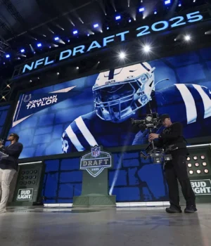 GREEN BAY, WISCONSIN – 25 DE ABRIL: O running back do Indianapolis Colts, Jonathan Taylor, anuncia uma escolha durante a segunda rodada do Draft da NFL de 2025 em 25 de abril de 2025 em Green Bay, Wisconsin. (Foto de Perry Knotts/Getty Images) | Imagens Getty