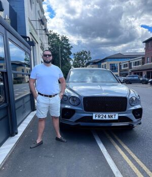 Frank Tomney pose com Bentley que parece mostrar placa de números personalizados