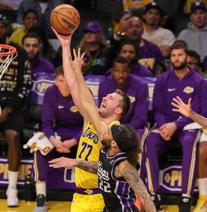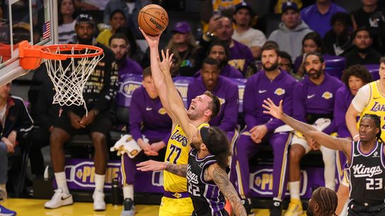 # 77 PG Luka Doncic do Los Angeles Lakers faz uma bandeja durante um jogo da NBA contra o Sacramento Kings em 17 de outubro de 2025 em Los Angeles, CA.