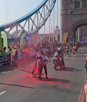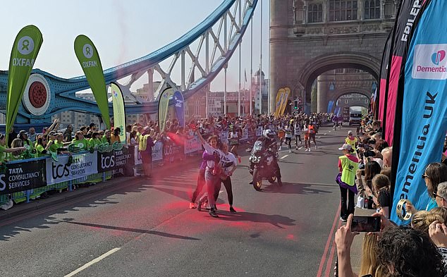 Na manhã de domingo, enquanto os corredores de elite atravessavam o rio Thames, o pessoal agitou a ponte da torre e jogou o pó rosa brilhante do outro lado da estrada.