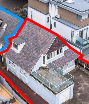 Um desenvolvedor provocou indignação após planejar reformar um bangalô de praia (vermelho) que supostamente ofuscará as casas dos vizinhos nos fundos (azul).