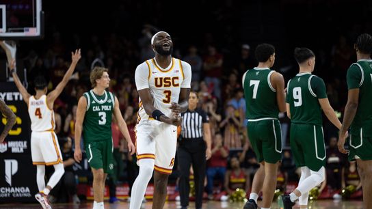 O guarda da USC Chad Baker-Mazzara (4) dirige até a cesta durante um jogo de basquete Big Ten contra Cal Poly, segunda-feira, 3 de novembro de 2025, em Los Angeles, Califórnia.