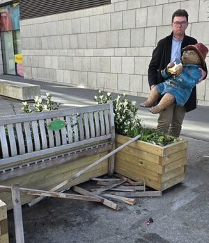 “Nosso querido banco Paddington levou uma surra no fim de semana em Guildhall Square. Boas notícias, Paddington vive!