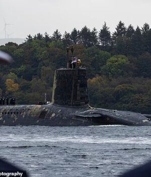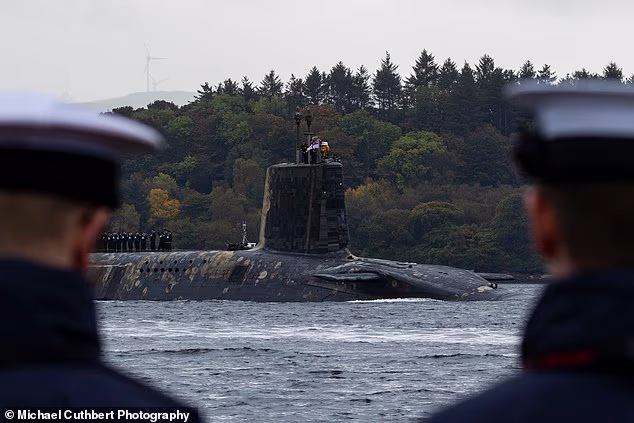 O submarino da classe Vanguard foi recebido no porto com suas tampas finas e queimadas.