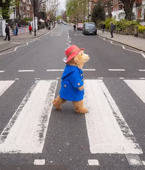 Paddington parecia sensacional em seu icônico chapéu vermelho e casaco azul com botões enquanto recriava a famosa imagem da passadeira de zebra do álbum de 1969 dos Beatles.