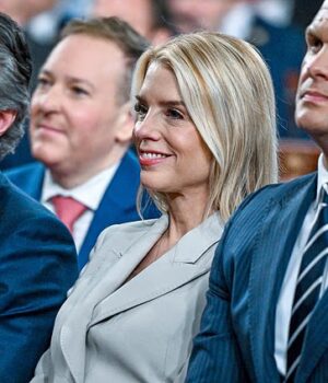 Enquanto Trump dizia que “o Dow Jones ultrapassou os 50.000, quatro anos antes do previsto”, as câmaras conscientemente apontaram para Bondi, que podia ser visto a sorrir para o presidente.