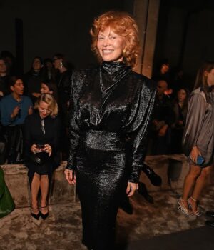 Pamela Anderson mostra seu novo cabelo ruivo quando você se mistura com Windur na primeira fila no desfile da semana de moda de Paris em Magler
