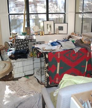 Os tecidos montados por décadas enchem alguns quartos na ampla casa de Santa Fay, enquanto outros itens, incluindo camas de cachorro, pacotes de comprimidos e camas, são vistos se estendendo pelo chão.