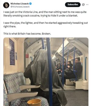 Nicholas Lisak postou o incidente na plataforma de mídia social e disse: “Eu estava na Victoria Line, e o cara sentado ao meu lado estava literalmente fumando crack, tentando escondê-lo debaixo de um cobertor.