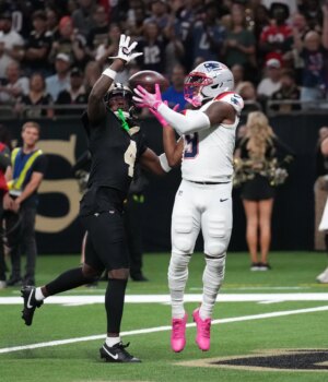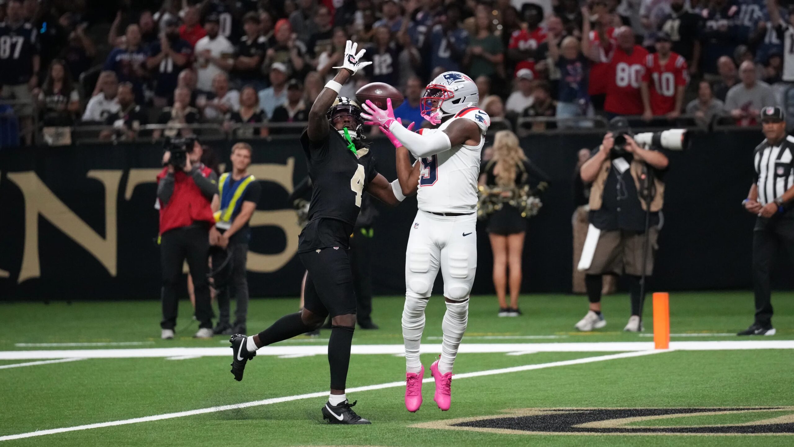 Eles estavam ligados a um par de touchdowns durante todo o jogo que manteve na frente dos patriotas. O primeiro touchdown veio no final do primeiro quarto, espalhando ao seu redor um zagueiro santo. É um lance bem colocado que permite que ele faça uma jogada e consiga uma recepção competitiva.