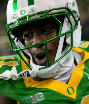Com o verdadeiro cornerback calouro de Washington, Dylan Robinson, segurando o braço esquerdo de McClellan, o calouro redshirt usou o braço direito para pegar um passe de Dante Moore por cima do ombro.