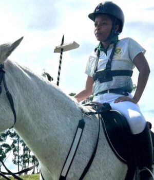 Montando um cavalo galopando com uma lente na mão direita, a face do rosto de Khosi Dolomo é a imagem da densidade como é seu alvo.