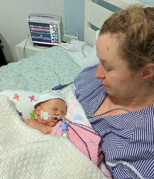 A equipe teve dificuldade para encontrar os batimentos cardíacos de seu bebê e, após vários atrasos, ela nasceu por meio de uma cesariana de emergência.