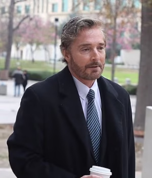 Peter Grossman apareceu pessoalmente vestindo um terno preto sob um casaco escuro para se proteger da chuva forte e do vento em Van Nuys.