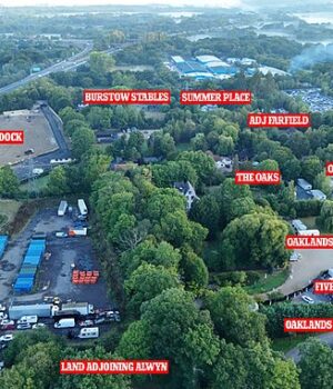 Proprietários de casas em uma vila de Surrey temem que suas propriedades multimilionárias tenham ficado sem valor depois que viajantes araram terras no cinturão verde e se deslocaram em dezenas de caravanas sem permissão.