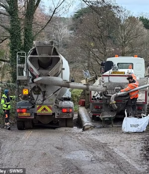 Um caminhão de cimento bloqueia a estrada durante a construção em Awkward Hill, em Bibury, no ano passado