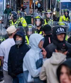 Felizmente, a reunião de quarta-feira não se tornou seriamente violenta até que alguns adolescentes atiraram vasos de plantas e cones de trânsito na polícia – antes de serem repreendidos por adultos na multidão.