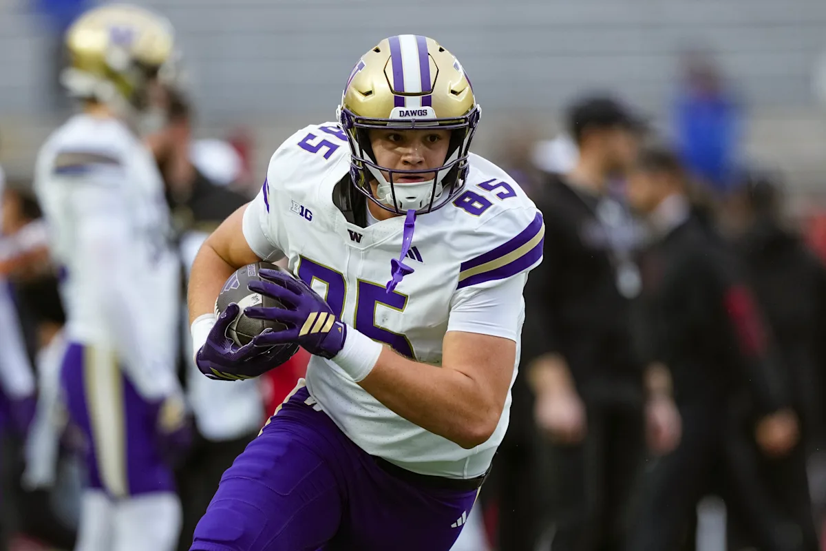 8 de novembro de 2025; Madison, Wisconsin, EUA; O tight end do Washington Huskies, Barron Nowon (85), durante o aquecimento antes do jogo contra o Wisconsin Badgers no Camp Randall Stadium. Crédito obrigatório: Jeff Hanisch-Imagn Images | Imagem de Jeff Hanisch-Imagon