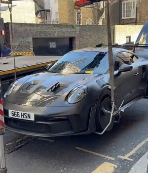 Em imagens obtidas exclusivamente pelo Daily Mail, um Porsche 911 GT3 RS preto pode ser visto estacionado entre um conjunto de linhas amarelas em uma estrada lateral perto de Kensington High Street, no oeste de Londres.