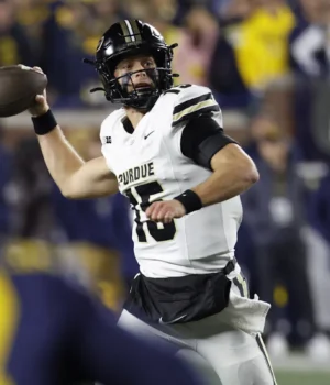 Agora vamos ao QB original, Ryan Braun. O jogador de 6-4 e 210 libras está em seu terceiro ano no programa e é forte e atlético na posição. Ele tem 47 tentativas planejadas de corrida para 254 jardas e quatro touchdowns na temporada. Ele não tem medo de abaixar o ombro e é um pouco mais arrogante do que você poderia esperar de alguém do tamanho dele. Por outro lado, ele foi atingido cinco vezes. Passando, ele está completando 60,5% de seus passes para 1.898 jardas, nove touchdowns e oito interceptações. A PFF observa nove “grandes lançamentos” e 11 jogadas dignas de virada. Ele é um jogador de teto alto com alguma habilidade explosiva, mas comete muitos erros e não recebe ajuda suficiente ao seu redor. Assim que ele começou a arremessar mais de 10 jardas no campo, seus números despencaram. Mas, no final das contas, esses erros lhe custaram caro: ele teve três interceptações na zona vermelha contra o USC, fez uma escolha de seis no quarto período contra o Minnesota e teve outra virada no minuto final contra o Rutgers. Tanto Minnesota quanto Rutgers foram jogos absolutamente vencíveis no final, acrescentou Sting.