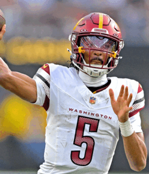 Pela foto – figura do Imam. O quarterback do Washington Commander, Zeden Daniels (1), vê o carregador de Los Angeles no Sophie Stadium.