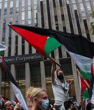 Centenas de manifestantes na NWC reuniram-se em frente ao edifício Fox News e em frente aos campi universitários, com as bandeiras palestinas tremulando e gritando: “A Palestina será livre do rio ao mar”.