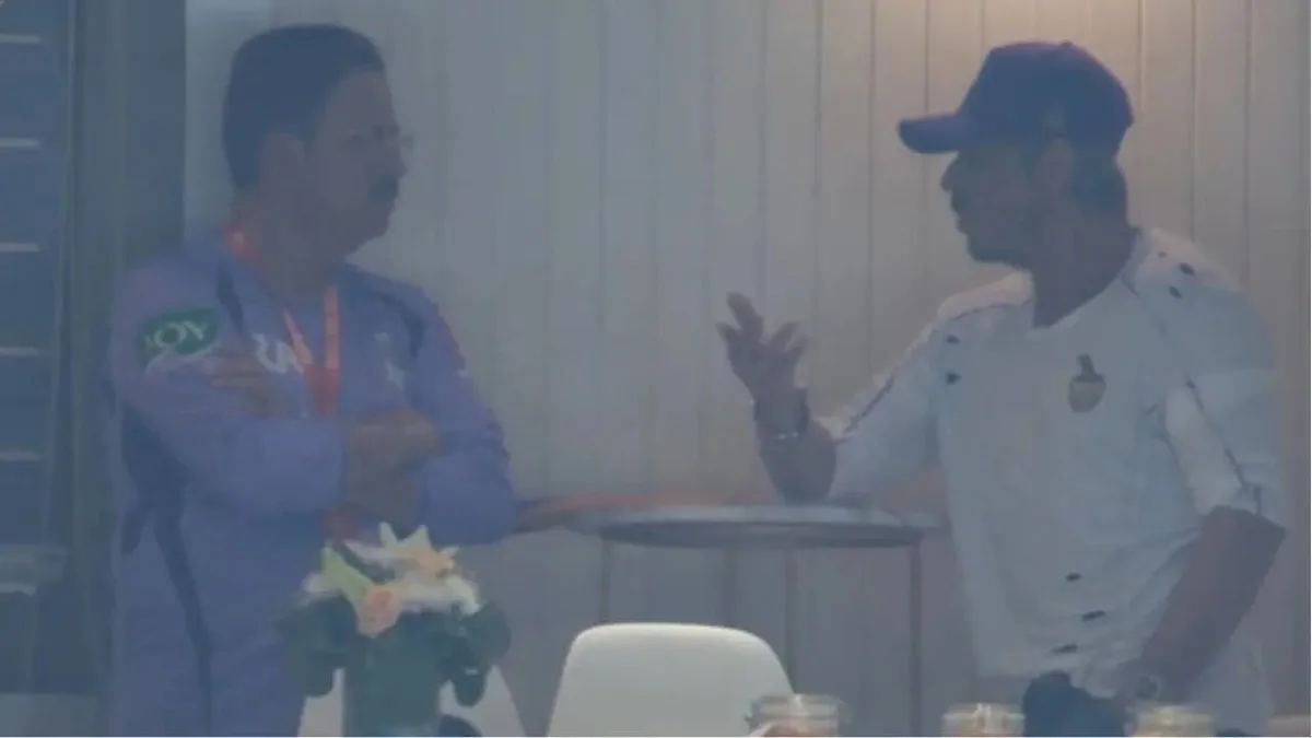 Durante o intervalo para chuva, as câmeras mostraram o coproprietário da KKR, Shah Rukh Khan, discutindo com o CEO da equipe, Venky Mysore. A conversa parecia séria, com Mysore ouvindo Shah Rukh Khan falar e fazer gestos com as mãos.