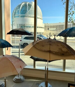 Um protótipo de guarda-chuva com um mapa de constelação exibido no lobby do Miro será usado no evento “Flash Art” da artista “Invisible Skies” Elizabeth Turk na Prefeitura de San Jose em 31 de janeiro de 2026. (Sal Pizarro/Bay Area News Group)