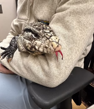 Tegu foi enrolado em uma camiseta para conservar um pouco do calor corporal e os coproprietários do ET Reptiles, Taylor e Emily, foram contatados para obter ajuda.
