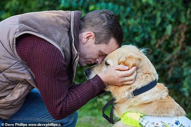 Scott, que começou a perder a visão em 2019, é fotografado com seu querido cão-guia golden retriever, Milo