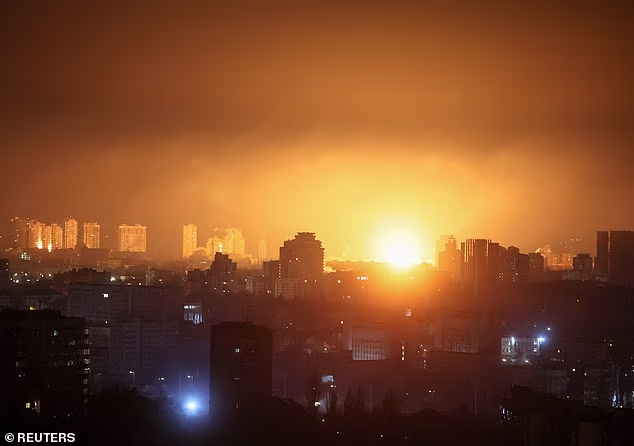 Uma explosão ilumina a paisagem urbana durante um ataque russo com mísseis e drones em meio ao ataque da Rússia à Ucrânia em Kiev, Ucrânia, em 14 de novembro de 2025.