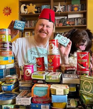 Ansell analisa latas de peixe de todo o mundo, muitas vezes usando um fez na cabeça e acompanhado por seu cachorro, o Rei Arthur.