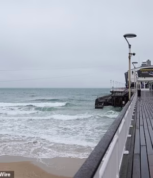 Os surfistas não aproveitarão o tempo tempestuoso neste fim de semana, algumas famílias não fornecerão nada para a eletricidade. Uma pessoa surfa o mar do lado de fora do colega de Bornemouth