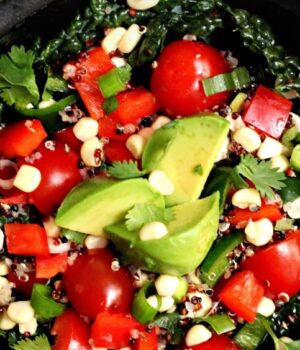 Em uma tigela separada, misture milho, escalies, pimenta, tomate, quinoa, salsa e focaentro. Mexa cerca de 1/4 de xícara de molho na salada e misture delicadamente. A salada em cima do tempo é a onça (ou divida as tigelas individuais). Cubra com abacate e chuva com excesso de vestir no sabor.