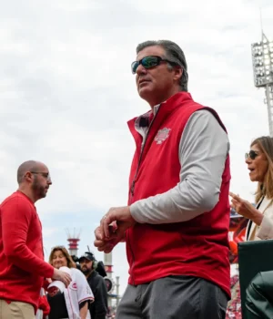 Phil Castellini, mostrado antes do jogo do dia de abertura contra o San Francisco Giants em 2025, foi nomeado para suceder seu pai como proprietário controlador. Gordon Wittenmyer e Jason Williams concordam que o anúncio da mudança foi mal administrado.
