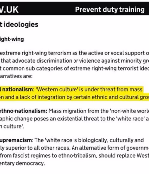 E no ano passado foi publicado o documento de formação Prevent, que partilhava a opinião de que a cultura ocidental “sob ameaça da imigração em massa e da falta de integração” era uma “ideologia terrorista”.