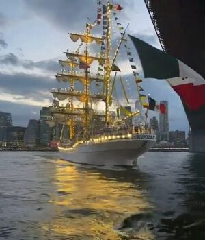 Um navio longo da Marinha mexicana, um festival em Nova York foi devastado na ponte do Brooklyn