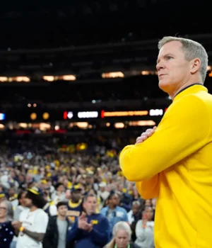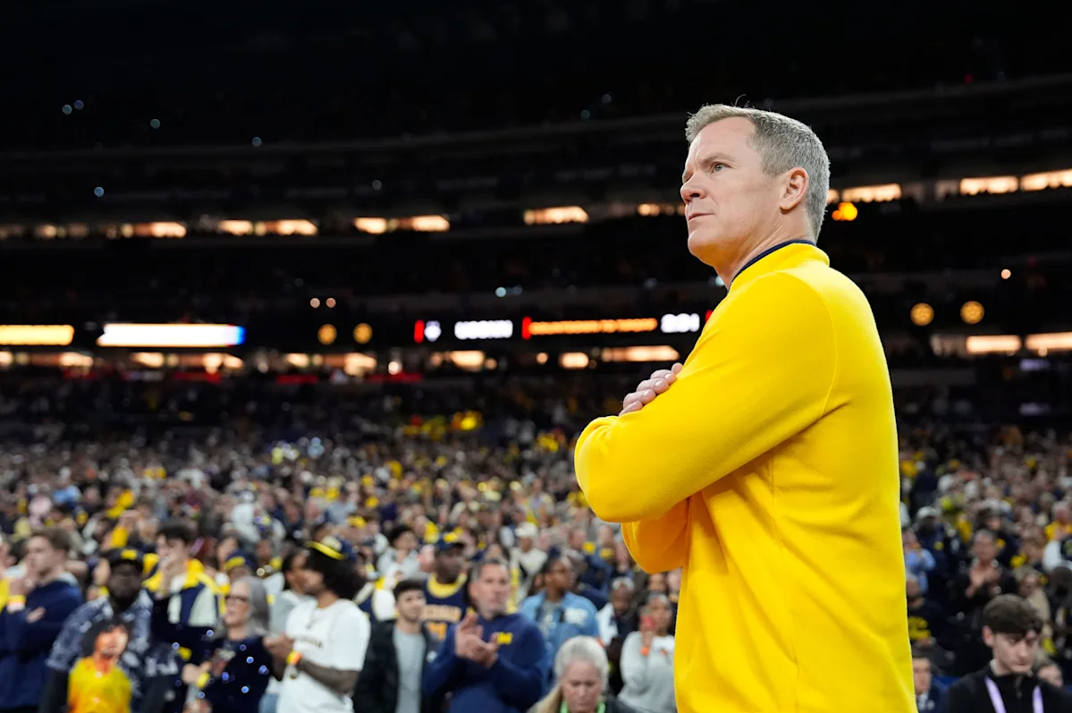 O técnico do Michigan, Dusty May, assiste da quadra antes do jogo do campeonato nacional da NCAA contra Connecticut no Lucas Oil Stadium, segunda-feira, 6 de abril de 2026, em Indianápolis.