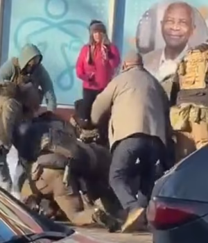 O vídeo mostra agentes lutando contra o homem e levando-o ao chão.