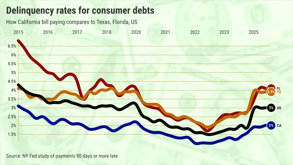 Um relatório do Fed de Nova Iorque mostrou que 1,9% da dívida do consumidor da Califórnia, em média, estava vencida há 90 dias ou mais até 2025. A minha fiel folha de cálculo mostra que isto é muito melhor do que os 3% da dívida do consumidor inadimplente em todo o país. Para os dois principais rivais económicos da Califórnia, Texas e Florida, a taxa foi de 3,9%.